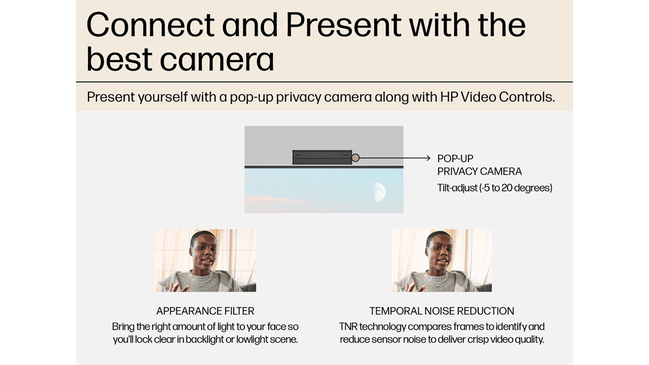 Enhance every call with Windows Studio Effects, AI noise removal, and a tilt-adjustable pop-up camera.[2]